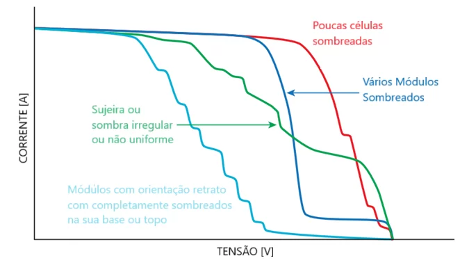 - Não-hardware: Sombreamento severo de uma ou mais células, que ativa os diodos de by-pass e pode “ocultar” a VOC real.