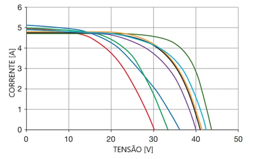 Figura 3 – Efeitos do Diodo de By-pass. As curvas mostram as reduções de 10–12 V em VOC, típicas de diodos de by-pass em curto-circuito em módulos fotovoltaicos de 72 células e 3 diodos.