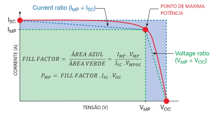 Figura 6 – Equações e representações gráficas para: Current Ratio (linha azul tracejada), Voltage Ratio (linha verde tracejada) e FILL FACTOR (área verde ÷ área azul).